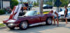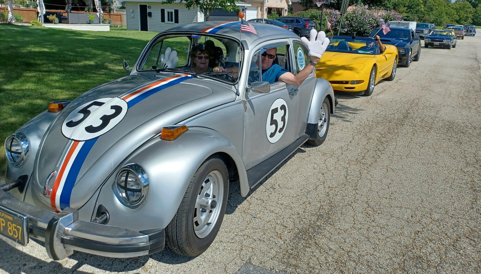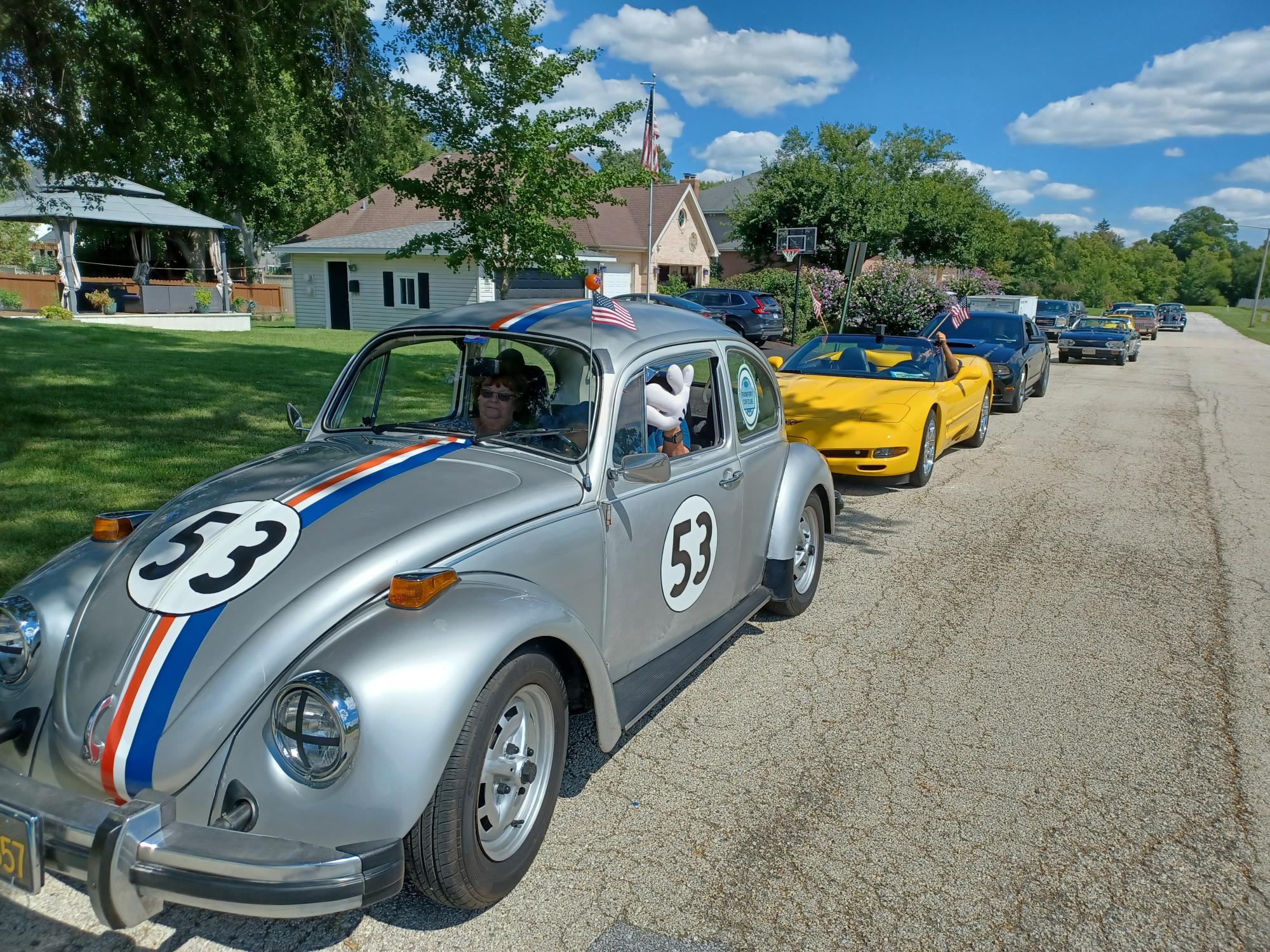 FCC once again participated in Frankfort’s Fall Fest Parade over Labor Day weekend. Mild temperatures brought huge crowds to town, which helped both drivers and our cars endure the slow crawl. On hand and leading our pack was Joe & Diane Tanzillo with the Herbie inspired #53 Beetle (picture 7) ; Dino Deluca in the yellow Corvette (pic. 2) ; Trevor Sibley in his Roush edition Mustang (pic 6) ; Shelly Claypool in her 65 Corvair (pic 4) ; Larry Claypool in the Subaru 360 (pic 8); John Blaskie in a 1984 AMC Eagle (pic 9); Lance in a Buick Roadmaster wagon (pic fall) ; Wayne Lucht in the 55 Plymouth (pic 5), and rounding out our group was Tom Mantel in the ’40 Packard Limo. (pic pac). The cars all behaved in the slo-mo mode, and the announcer was pretty well versed with our vehicles as we passed the reviewing stand. It’s on You Tube- we are at the 43:40 mark in the video.